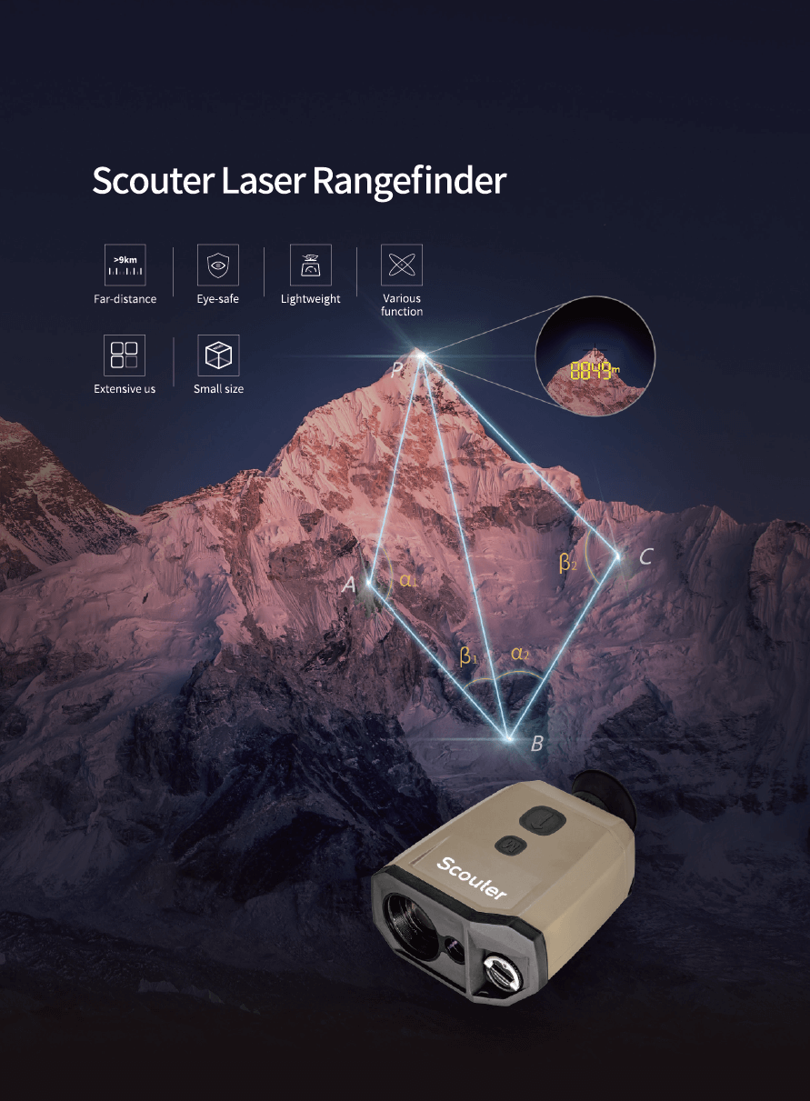 The Scouter Laser Rangefinder is a compact, high-precision device primarily designed for single-hand operation or tripod use for long-distance targets. It features ranging functionality, including measuring the distance between two targets, angle measurement, and real-time data display within the eyepiece. Additionally, the device supports data transmission via extended modules such as GPS, Bluetooth, and Wi-Fi.