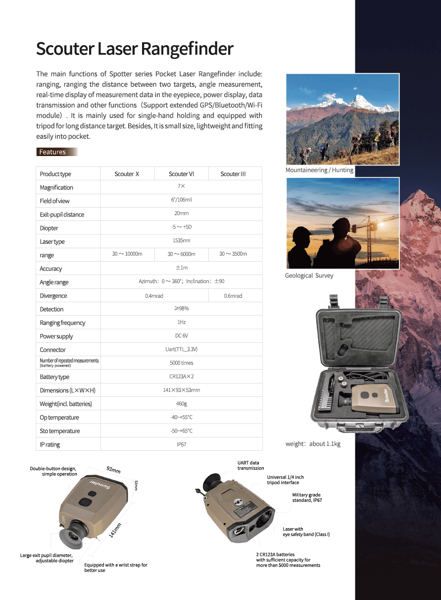 Its small size, lightweight build, and ease of portability make it ideal for outdoor applications. It offers reliable performance with a 1535nm laser and different models provide ranging capabilities from 30 to 10,000 meters, depending on the variant. The Scouter is built for durability with an IP67 rating, operating at temperatures between -40°C to +55°C and capable of withstanding extreme storage conditions.