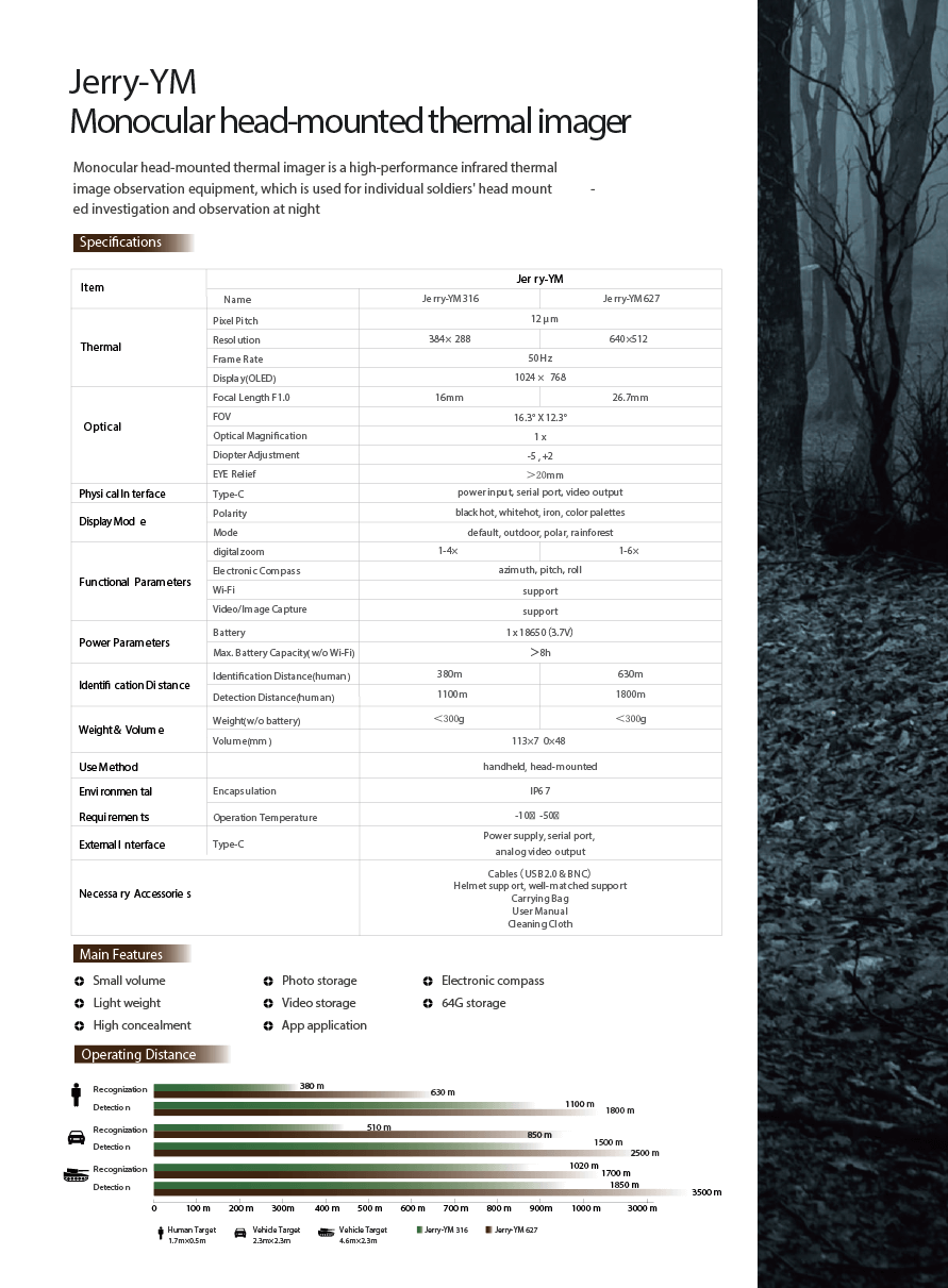Equipped with multiple display modes like Black-hot, White-hot, Green-hot, and Red-hot (with adjustable thresholds), the Jerry-YM delivers clear and adaptable thermal images. It also supports Outline mode and can be used in Clip-on mode, allowing integration with night vision devices. With enhanced image processing and options like picture-in-picture, it provides detailed and sharp visuals, ensuring reliable performance in tactical or outdoor environments. The device features Type-C connectivity for data transmission and power supply, powered by a 3.7V battery. Ideal for military, outdoor enthusiasts, hunters, and search-and-rescue operations, this monocular offers superior thermal imaging in a durable, user-friendly package.