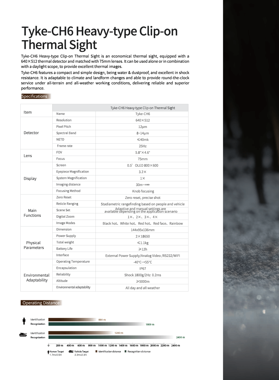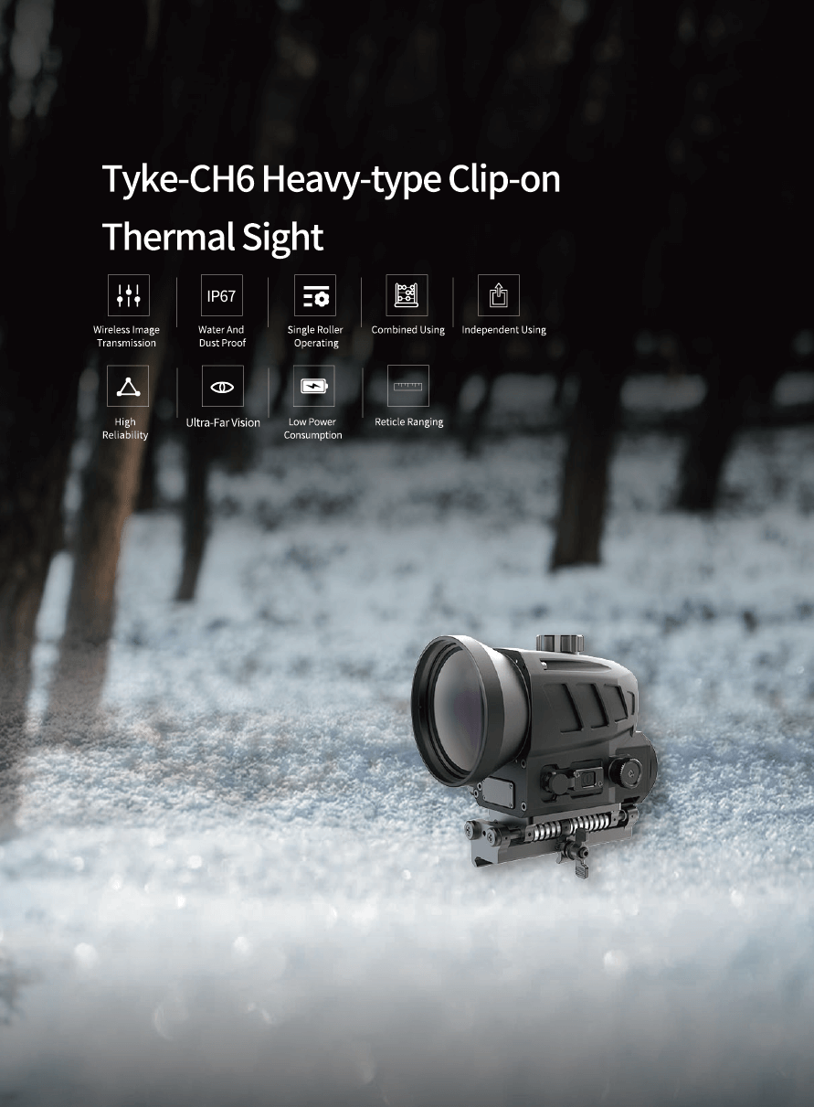 The Tyke-CH6 Heavy-type Clip-on Thermal Sight is an affordable, high-performance thermal imaging device equipped with a 640×512 thermal detector and a 75mm lens, designed for use independently or in combination with daylight scopes. Its 3.2× optical magnification and 5.8°×4.6° field of view deliver precise thermal imagery for long-range targeting, while its compact and rugged design ensures excellent performance in various terrains and weather conditions.